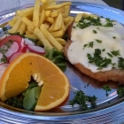 Schätzchen wählte aus der abgespeckten Sonntagskarte das Bayrische Schnitzel mit Pommes und Salat (10,50 €). Das panierte Schnitzel war mit Käse überbacken. Zwischen Schnitzel und Käse wurde eine Schicht Meerrettich aufgebracht, welche für ein sehr gutes Geschmacksaroma mit angenehmer Schärfe sorgte. Das Schnitzel war perfekt gebraten, die gut gebräunten Pommes in Ordnung. Der dazugehörige, frischgemachte Salat wurde mit auf dem großen Aluteller serviert. Zufriedenheitsgrad meiner charmanten Begleiterin hoch.