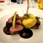 das Fleisch von „Frankreichs beliebtester Ente“ war rosa, saftig und überzeugend. Die Haut nicht so kross, wie ich es mag, aber mit schöner Röstnote. Auch die Begleiter gut, der Kartoffelstampf noch etwas stückig mit untergehobenem Ziegenkäse. Kräftige Sauce, gute Shitakepilzen und als überraschende Fruchkomponente gut ausgewogener confierter Rhabarber. Das hat Spaß gemacht. Aber für die Bewertung muss entscheidend sein, was die Küche zunächst zum Gast schickt, nicht die Nachbesserung. Der Gang wurde komplett von der Rechnung genommen, das hatte immerhin Stil.