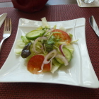 Während der nun folgenden Wartezeit tauchten verschiedene andere Servicekräfte auf und versorgten die drei anderen besetzten Tische im Wintergarten. Nach einiger Zeit wurde mir dann ein kleiner Teller mit Salat serviert, den ich gar nicht erwartet hatte. Eine kleine Portion verschiedener Blattsalate, mit je zwei Scheiben Gurke und Tomate, mit einem leichten Essig-Öl-Dressing, war bei den so gar nicht zur Jahreszeit passenden verhältnismäßig hohen Außentemperaturen durchaus erfrischend.