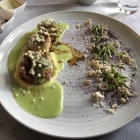 Wohlfühlteller, perfekt gebratener Fisch, schlotziges Püree aus Kichererbsen, kein Tahini drin. Recht scharfe Sauce auf Tomatenbasis. Schaum süß und nach Basilikum schmeckend. Bleibt ein kreatives Dessert zum Abschluss. Tiramisu / Schoko / Kaffee.