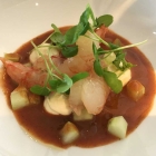 Wir starten langsam mit ausgezeichnetem, hauchdünn aufgeschnittenem Schinken vom Duroc-Eichelschwein und Austern, die mit Johannisbeeressig angemacht sind, der für meinen Geschmack nicht viel beisteuert. Petersilienstiele geben etwas Würze und Textur, ansonsten sind die Austern eben das, was sie sind. Und das ist auch eigentlich ausreichend.