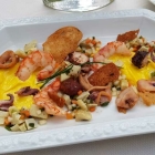 Aber machen wir uns an die Vorspeisen. Als erstes richten wir die Rotgarnelen an. Auf einem Bett von rotem Zwiebelchutney platzieren wir sie zusammen mit Filets von der Baumtomate, auch bekannt als Tamarillo. Der separate, knallrote Sud davon wird angegossen, Kaffir-Limetten-Öl über das Ganze gegeben und anschließend mit der zurzeit schwer angesagten Goa-Kresse garniert. Die steuert einen deutlichen Korianderton bei, was sich ausgezeichnet zu der insgesamt sehr frischen und aromatischen Komposition macht.