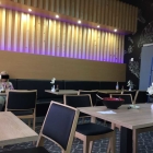 Neben dem Tresen gibt es ein paar Sitzmöglichkeiten und weiter hinten gibt es noch einen etwas größeren Bereich. Es ist eine Kombination zwischen dunkel und hell. Helles Holz, dunkle Wände und Sitzbezüge. Es gibt eine große Bank und der Rest besteht aus Stühlen. Die Tische dazu sind in verschiedenen Größen angerichtet . Für weniger und mehr Gäste, man kann sie auch so zusammenschieben wie man sie gerade braucht. Auf den Tischen gibt es mal wieder das stehen gelassene Geschirr von Gästen. Das werde ich nie verstehen, das ist doch nicht schlimm sein Geschirr weg zu räumen und das sind die ersten die bebbern wenn der Tisch nicht abgeräumt ist.