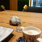 Ein süffiger Steinpilz-Schaumkuss war schneller genossen als geknipst. Auf Holzstäbchen einerseits ein ganz vorzüglicher Happen heiße Zitronen-Polenta mit Extra-Rauchmajo und andererseits Basilikum-Knusper, der der Küche leider zu hart geraten war.