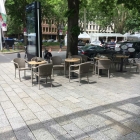 draußen mein Ort des Sehens...kleine Runde Tische, die nicht wackeln, mit Stühlen, auf denen man auch länger bequem sitzen kann.