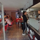 Im Schlauchförmigen „Drinnen“ war rechterhand die Theke mitsamt Bratstation und auf der linken Seite ein paar ordentlich gepolsterte Sitzplätze an Tischen der einfacheren Art. Insgesamt beengt blieb aber noch Platz für zwei große Flachglotzen an der Wand deren Programm ich aber beim kurzen Besuch drinnen nicht wahr nahm.