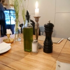 Für mich ja immer wichtig, wieviel Platz ein Wirt seinen Gästen einräumt. Das Nonne & Zwerg ist ein kleines Restaurant und da besteht ohnehin die Gefahr, dass man eng aufeinander hockt. Auch im Nonne & Zwerg wird das so sein, wenn alle Tische im Innenbereich stehen (am besuchten Abend stand eine Reihe draußen). Die Tische als solche sind an der Hohngrenze klein. Wir saßen zum Glück am Fenster, so dass wir mit dem Fensterbrett eine Ablage hatten und unser Bediener stellte ja den Nachbartisch direkt an unseren heran, weil ansonsten unsere sechs Vorspeisen, Brotkorb, Olivenölflasche, Pfeffermühle usw. auch nicht annähernd auf unserem Tisch Platz gefunden hätten.