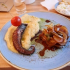 Der Oktopusarm war zart und lecker, aber auch eher vom Jungtier. Das (?) Fava war laut Erklärung ein Erbsenpüree und ähnlich flau wie das Hummus. Die Zwiebeln waren leicht aufgetürmt auf einem Balsamicospiegel, der die untere Zwiebelschicht für mich eindeutig übersäuerte. Zwiebel und Balsamico als ausgewogenen Süß-sauer-Gegensatz schätze ich durchaus, aber hier stand die Zwiebelsüße auf verlorenem Posten. Von der Komposition her ein Gericht, das bestimmt überzeugen kann, wenn Korrekturen beim Würzen vorgenommen werden. In der genossenen Fassung aber nur drei Sterne wert.