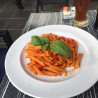 Penne Arrabiata mit Wunsch extra scharf. Der Kellner meinte nach dem er zweimal nachgefragt hatte – na gut wenn sie meinen-. Warum er das getan hatte wissen wir nicht. Es fehlte absolut an schärfe, na gut , wenn jetzt jemand überhaupt keine schärfe verträgt würde er sagen es sei ein wenig scharf. Man fand ein paar Stücke einer dezent scharfen Peperoni mit drauf, wenn man die Stücke die wir gefunden hatten zusammenfügt kommen wir vielleicht auf eine Peperoni. Die Nudeln waren schon über al dente gekocht , es befanden sich halbierte Cocktailtomaten mit dabei, geschmorte Zwiebeln und sie schmeckte halt nach Tomaten. Ein paar Kräuter konnten wir noch mit dabei finden . Wir würden sagen eine mild abgeschmeckte Tomatensoße. Oben drauf gab es noch ein Stück vom Basilikum und satt werden kann man von der Portion nicht gerade.