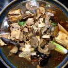 Aus den Weizennudeln, die auch als Einlage für die Suppen dienen, wird auch ein Nudelsalat mit süß-saurem Dressing angeboten, wahlweise mit Sojasprossen oder Morcheln. Für letztere entscheide ich mich. Es liegt nicht nur an der recht puristischen Version dieses Salats, dass ich hier noch ein wenig nachhelfen muss. Vielleicht ist das Dressing zu sparsam bemessen oder schon zu sehr in die Nudeln gezogen, aber insgesamt ist mir das etwas zu trocken und auch zu mild, so dass ich mit etwas Sesam- und Chiliöl nachhelfe und schon passt es. Gemessen an allen übrigen Gerichten bleibt dieser Salat aber aromatisch zu zurückhaltend, so dass ich zwar nicht unzufrieden bin, es aber auch nicht nach Wiederholung schreit.