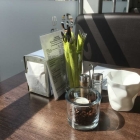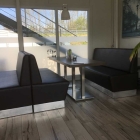 Rechter Hand kommt man dann zu einen Bereich mit Bänken und Tischen die alle eine Fensterfront haben. Die Bänke haben einen Bezug aus dunkleren Kunstleder. An den Wänden hängen Bilder und Blumenstöcke zieren den Raum.