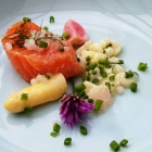 Nicht angekündigt der dazugehörige Spargel. Der mich umso mehr erfreute. Denn die Spargelzeit ist meine Zeit. Spargelspitze und fein marinierte Spargelscheiben ergänzten perfekt die Vorspeise.
