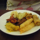 Meine Frau war mit dem Buffet zufriedener als ich; sie lobte speziell die vielen frischen Gemüse (bestimmt TK-Ware), die es sonst bei Asia-Buffets nicht geben würde, die Füllung der Frühlingsrollen, der Wan Tan-Taschen und das Sushi-Angebot, das ich wie immer nicht wahrnahm. Mir waren die gebratenen Nudeln zu matschig und geschmacklosere Garnelen als die hier in panierter und frittierter Form angebotenen habe ich Gottseidank bisher so gut wie nie gegessen. Ente und Huhn waren für Asia-Buffet "normal", die Tintenfischringe hätte ich besser weiträumig umfahren. Gut waren die Wan Tan und die kleinen Dumplings, erfrischend war das als Nachtisch angebotene Obst. Weder die knallrote noch die giftgrüne "Götterspeise packe ich bei Asia-Buffets je wieder an; probiert und für gut befunden habe ich die kleinen Schokoküchlein mit gehackten Pistazien obendrauf.