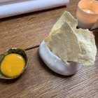 Ein in Dashi mariniertes Wachtel-Ei, vermutlich im Onzen-Stil wachsweich und halbiert, angegossen wurde ein intensiver Dashi-Sud. Wohlige Aromen-starke Genussküche waren diese beiden Teller, auch in Gang 5 sollte es so sein. Vom Wald ging es in den Stall, hoffentlich einer mit Auslauf.