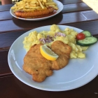 Die Speisekarte besteht aus einem Zettel der in einer eingeschoben ist. Auf einer Seite befinden sich die Getränke, auf der anderen Seite die Gerichte. Sie ist nicht zu überladen mit Gerichten, aber für einen bayrischen Biergarten fehtl uns das bayrisch. Schnitzel, Currywurst und Sparerips sind jetzt nicht so die typischen bayrischen Gerichte. Der Pächter will laut Aussage die jüngere Generation herlocken und dafür gibt es einige Burger. Ob das die ältere Generation so gut findet die hier immer ihre Braten gegessen haben wissen wir nicht. Uns ging es schon ab.