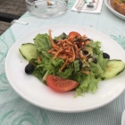 Der Salat bestand aus gemischten Blattsalat, zwei Tomatenachteln, zwei Gurkenscheiben und Gelberübenraspeln. Ach ja da waren ja auch noch zwei eingefärbte , kernlose , geschmacklose Oliven. Die anderen Zutaten waren frisch, es wurde Balsamico drüber geträufelt und unter dem Salat gab es noch ein ganz kleine Klitzigkeit Balsamicodressing. Salat durchgemischt, Sauerei gemacht durch die größeren Blätter, aber es wollte sich nicht an alle Salatblätter anhängen. Würden mal sagen , nicht der Rede wert.