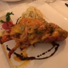 Hummer Thermidor mit einer Sauce Mornay gratiniert, dazu Rahmspaghetti und Beilagensalat. Ich bitte die Fotoqualität zu entschuldigen, aber die Lichtverhältnisse waren heikel und ich verwende kein Blitzlicht im Restaurant. Meine Frage nach der Darreichung bezog sich auf die Art der Darreichung von gratinierten Hummer in unserem Meeresfrüchtemekka, dem Restaurant L'Etrave in Cléden-Cap-Sizun, Bretagne, Frankreich, dort ist immer ein Quadratmetergroßer Latz notwendig, um den Hummer zu verzehren. Hier war es nicht so, der Hummer war ausgelöst, und dann wieder in die Panzer gelegt worden, um danach gratiniert zu werden. So konnte er unfallfrei mit Messer, Gable und Hummernadel verzehrt werden. Die Güte des Gerichts erschließt sich hier