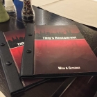 Die Speisekarte hat einen schwarz-roten Einband und im inneren befinden sich Klarsichthüllen. Der Name des Restaurant steht mit drauf und von außen sieht sie schon ein wenig abgenutzt aus.