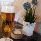 Wir stöberten derweil in der Karte und waren uns dann auch schnell im Klaren darüber, was wir trinken und essen wollen. Nach ca. 20 Minuten war sie immer noch nicht an unserem Tisch aufgetaucht und so begab ich mich ins Innere des Lokals, um nachzufragen, ob sie uns vergessen hat. Entschuldigung, nein, ich komme gleich, sie sehen ja, was los ist. Dabei fiel mir auf, dass sie die einzige Servicekraft war, und durch die offene Tür zur Küche konnte ich erblicken, dass der Koch auch mutterseelenallein in der Küche werkelte. Und in der Tat, sie kam kurz danach an unseren Tisch und nahm unsere Getränkebestellung auf. Für mich ein Jever Pils vom Fass (0,4 l, 2,90 €), für Schätzchen ein alkoholfreies Edelweißbier vom Allgäuer Büble aus der Flasche (0,5 l, 3,20 €). Es dauerte nochmal ca. 10 Minuten, bis die Getränke serviert wurden. Wenigstens waren sie super gezapft, resp. eingeschenkt und ordentlich kühl. Bei der Gelegenheit gaben wir ihr schnell noch unsere Essenswünsche an.
