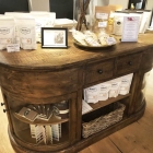 Das Beiwerk (Kaffee, Kleingebäck) wird in einem antiquarischen Regal repräsentativ ausgestellt.