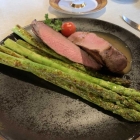 Der Hauptdarsteller meines Hauptganges, bestellt war medium, serviert wurde medium. Das Fleisch hatte ausreichend Wildaroma, natürlich magerer als ein Zuchtschwein, aber trotzdem saftig lag es auf dem Teller. Keinerlei Fleischsaft lief heraus, dass Fleisch hatte gut geruht nach dem Braten. Ganz nach meinem Geschmack der scharf angebratene grüne Spargel. Einzig die gute Jus war etwas zu knapp für die Rösties dosiert. Allerdings ist mir etwas zu wenig deutlich lieber als ein von Sauce überfluteter Teller. Ich war sehr zufrieden. Zu meiner Linken hatte sich meine Frau ein Kalbfleischgericht bestellt.