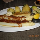 Das war sowas von lecker ! Ich hätte mich rein legen können. Danach war ich aber auch sehr sehr satt. Es war Fertigteig für die Reibekuchen,den man ja in Eimern bekommt,aber noch verfeinert und sehr gut gebraten. Knusprig außen und saftig innen. Das Fleisch war butterzart und überhaupt die ganze Kombination. Habe ich so noch nie auf einer Karte gesehen.