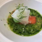 Der Fisch war gedünstet worden bzw. sanft in Öl gegart. Die Lamellen lösten sich leicht. Der Geschmack war sanft; das Fleisch war saftig. Das Püree war sehr fein zerkleinert worden, aber kein Brei. Das Lauchgemüse und kleine Salatspitzen umhüllten den Fisch. Obenauf war die schaumige Sauce verteilt worden.
