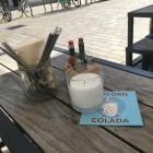 Auf dem Tisch gibt es die Karten, einen Ständer mit Tabasco Soßen Salz-und Pfefferstreuer, ein Glas mit Kerze und ein Glas mit Besteck und Servietten. Ein Windfangaschenbecher steht auch noch mit auf dem Tisch.
