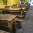 Vorm Haus gibt es einen größeren Außenbereich mit längeren Tischen und Bänken dazu. Es ist irgendwie ein Metallgestell mit Holzinnenleben. Beschattet wird durch große helle Sonnenschirme.