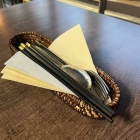 Die sind tatsächlich hausgemacht, man kann zusehen, wie ein Koch die auf Vorrat herstellt. Gefüllt klassisch mit Schweinefleisch, nicht Vietnam, aber dass können sie. Sauce dazu vermutlich aus der großen Flasche. Mit den Vorspeisen kam das Besteck.