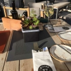 Das Restaurant bietet im Innenbereich ca. 40 Plätze, im OG einen separaten Raum für Veranstaltungen für bis zu 40 Personen und eine Aussenterrasse mit ebenfalls ca. 40 Plätzen. Wir haben uns in der Nähe einen Parkplatz gesucht und sind direkt vom hinteren Bereich auf die Terrasse gelangt. Hier haben wir uns noch einen der letzten schattigen Plätze unter einem der großen Sonnenschirme gesichert.