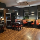 Oben im Lokal wurden wir gleich sehr freundlich von einer sehr jungen Dame begrüßt, man schien sich doch schon etwas besser zu kennen. Uns wurde ein Platz am Fenster zugewiesen, allerdings hätte es auch irgendeine Nische sein können, denn wir hatten genügend zu erzählen und uns erst einmal richtig kennen zu lernen. Dabei ist das Milan modern und gemütlich eingerichtet. Große dunkle Tische, breite, mit rotem Stoff bezogene Bänke, ja hier war es gemütlich.