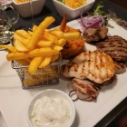 · 1x Grill-Teller „L“ (ca. 550 gr) mit Fleischspieß, Hähnchenbrust, Schweinesteak, Hacksteak, Rinderleber und Cevapcici mit Pommes Frites und Djuwetschreis und Salatteller für 24,50 €