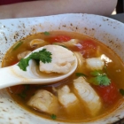 Die beiden Suppen ließen nicht lange auf sich warten. Sie wurden zeitgleich mit den Dim Sum serviert. Beide waren in zeitgemäße Keramik gefüllt und dufteten vielversprechend. Die Fischeinlage der Fisherman’s Soup machte ihrem Namen alle Ehre. Neben Lachs- und Butterfischfetzen tummelten sich frisches Koriandergrün und Tomatenstücke in der leicht säuerlichen Brühe. Meine Kokossuppe war tadellos abgeschmeckt und bewegte sich im zurückhaltenden Schärfegrad. Aroma dank Currypaste – auf diese einfache Formel war auch hier Verlass.