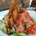 Mein aufgetürmtes Rohfischgebilde kam wohl auch gerade frisch aus der Teriyaki-Dusche. Hier bildeten Rettichstreifen und Salatschnipsel zusammen mit Wakame und Tomatenklein eine frische Basis, auf der es sich Sushi-Reis und Rohfischkonsorten gemütlich gemacht hatten. Dünn abgesäbelte Tranchen Thunfisch-, Lachs- und Jakobsmuschelsashimi lagen andächtig neben knusprigen, mit Pankomehl panierten Garnelenschwänzen sowie lediglich gekochten Vertretern ihrer Art. Das war genauso ansehnlich wie es gewöhnlich schmeckte. Nämlich in erster Linie nach der inflationär verspritzten süßlichen Sauce auf Sojabasis.