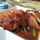Die Speisenkarte kam laminiert und in doppelseitig bedrucktem DIN-A3-Format an den Tisch. Ein Dutzend Vorspeisen, wovon die Hälfte aus der Suppenschüssel zu löffeln war, ein paar Salate, zehn verschiedene Wok-Gerichte bzw. Curries, Bratreis und Bratnudeln in diversen Ausführungen sowie fünfmal Fisch und fünfmal Vegetarisches stand da gelistet. Bei vielen Speisen konnte man – wie man es beim Asiaten gewohnt ist – die Fleisch- bzw. Fischeinlage wählen. Zwischen knuspriger Ente und gebratenem Huhn lag eine Preisspanne von 3 Euro.