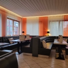 Hier bekamen wir unser Plätzl zugewiesen. Dieser Gastraum war modern eingerichtet. Große, schwere, breite und vor allem saugemütliche Ledersofas standen hier um die Tische. Die Tische boten genügend Platz für die Speisen und Getränke. Eine helle Paneel Decke mit dezenter Hintergrundbeleuchtung erhellte den Raum.