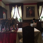 Die Fenster sind orientalisch dekoriert mit verschiedenen Vorhängen versehen und die Wände zieren Bilder mit indischen Motiven. Auf dem Tisch liegt in der Mitte eine rot-weiß-gemusterte Serviette und darauf steht eine Öllicht Lampe. Die Tische sind alle bereits eingedeckt mit Besteck und auch wieder rot-weißen Servietten.