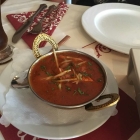 Es gibt hier eine Ledereinbandkarte in der ein Zettel mit den Daten vom Lokal eingeschoben ist. Im inneren gibt es Klarsichthüllen und die Seiten sind in rot bedruckt und mit Muster ein wenig verziert. Es gibt hier die üblichen indischen Gerichte, auch eine Auswahl an vegetarischen Gerichten. Von Montag bis Freitag gibt es günstigere Mittagsmenüs. Hierzu gibt es Suppe oder Salat zur Auswahl.