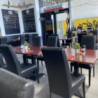 Am Rang gibt es eine Eckbank und es gibt hohe Stühle , alles mit schwarzen Kunstleder. Die Tische haben eine einfache Kunststoffplatte. Stühle und Bänke sind zum Teil schon etwas abgenützt.