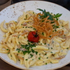 Kommen wir zu den hausgemachten Käsespätzle. Eine ordentliche, für Schätzchen eigentlich zu große Portion, aber klasse im Geschmack, besonders der Käse, nach Rückfrage von mir Gouda, stach durch Würzigkeit hervor, die Rostzwiebeln sehr aromatisch, das ganze Ensemble passte.