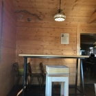 Im , sagen wir mal Hauptraum war schon alles voll und so gingen wir in den Nebenraum. Der füllte sich aber auch ganz rasch. Es ist eine Art Holzhütte mit Fenstern und Vorhängen dazu. Rechts und links gibt es eine lange Bank mit Art Teppichpolstern aus Fleckerteppich in bunter Farbe. Dazu helle Tische und dunkle Stühle dazu. Es ist schön warm und hell hier und ein paar Bilder zieren den Raum.