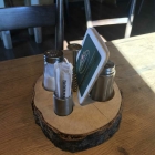 Auf dem Tisch steht ein Holzbrett mit Schraube als Griff und in Mulden befinden sich Salz-und Pfefferstreuer, Zahnstocher und Bierdeckel. Ist wirklich hier sehr schön gemacht für einen Imbiss, hat uns gefallen.