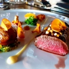 Wie bei allen Tellern suchte die Küche nach vielfältigen, aber harmonischen Kombinationen und fand sie mit wildem Brokkoli, gebackener Aprikose und Pfifferlingen. Sehr erfreulicher Fleischgang!