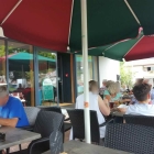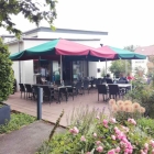 Eine ausladende sonnenbeschirmte Terrasse lud uns natürlich ein draußen zu sitzen. Haben Sonnenschirme ja nicht nur die Eigenschaft Schatten zu spenden sondern auch den einen oder anderen verirrten Regentropfen vom Bierglas fern zu halten.