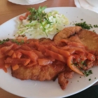 Ein riesiges Schnitzel bedeckte den Teller, nicht zu dünn, sondern was für richtige Männer. Die Panade knusprig, goldgelb. Der Koch verstand es Schnitzel zu braten.