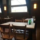 Es gibt außen rum eine Eckbank und dazu Tische mit einer schönen hellen Tischplatte. Die Stühle dazu erinnern uns irgendwie an die Gasthäuser aus der Jugend. Schön wären hier auch noch Sitzkissen das man nicht so hart sitzt. Wir konnten im ganzen Gasthaus nur 3 Stück ausfindig machen.