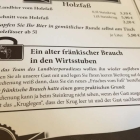 Es gibt einen Hauptgastraum in dem sich die Schenke befindet und einen Nebenraum den man auch abtrennen kann. Es ist sehr einfach und schlicht gehalten. Ein paar getrocknete Hopfenreben hängen an der Wand und ein Bierfass dient als Tisch zur Deko. Es geht eine komplette Holzverkleidung hier an der Wand rum und oben als Abschluss befindet sich ein Regal. Dieses ist bestückt mit lauter gleichen Steinkrügen vom Gasthaus.