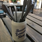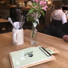 Auf dem Tisch gibt es einen Krug mit Besteck und Servietten und eine Vase mit frischen Blumen.