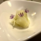 Hamachi an pikanter Vinaigrette mit Shiso und Jalapeño war ein durch mich kalt angerichteter Gang und der nächste, der uns lehren würde, dass es einen Unterschied zwischen dem heillos ambitionierten, aber nicht immer so begabten Hobbykoch Carsten und Anton Pahl gibt. Seit ich Gelbflossen-Makrele auch bei uns auf dem Markt bekommen kann, ist sie zu einem meiner liebsten Fische avanciert. Naturell lag ein Stück Filet auf dem Teller, mit schwarzem und weißem Sesam bestreut, ein kleiner Klecks einer fruchtigen Creme und einer Blüte, die Transport und anrichten überstand. Ein Saucenspiegel, in dem Shiso und Gurke die Hauptzutaten waren, ergänzte das. Für mich bisher bester Gang!